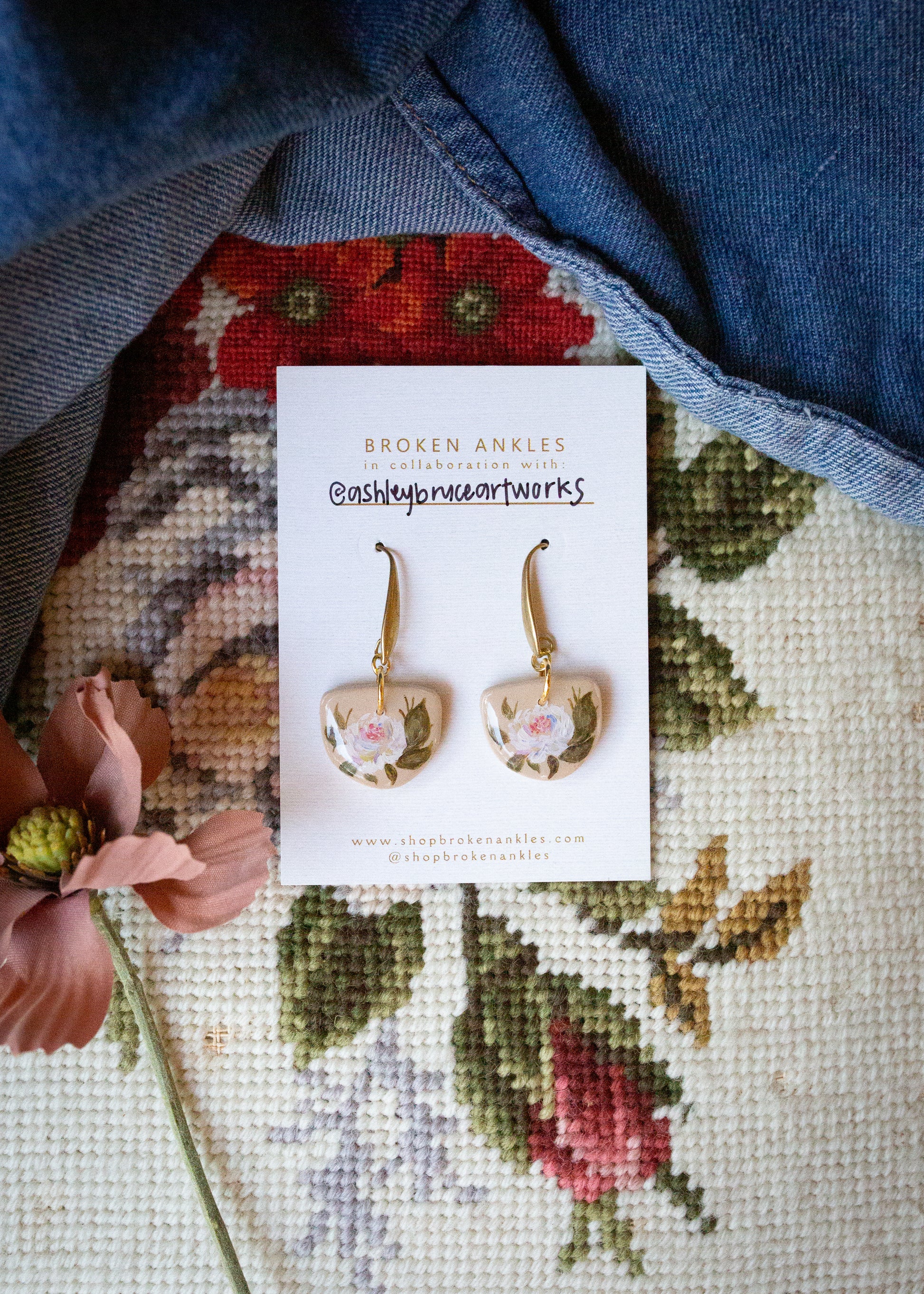 These earrings are handmade in Woodstock, GA. They are made from Polymer Clay, hand printed by @Ashleybruceartworks, and sealed with a resin finish. They are very light and can add the perfect pop of color to an outfit.