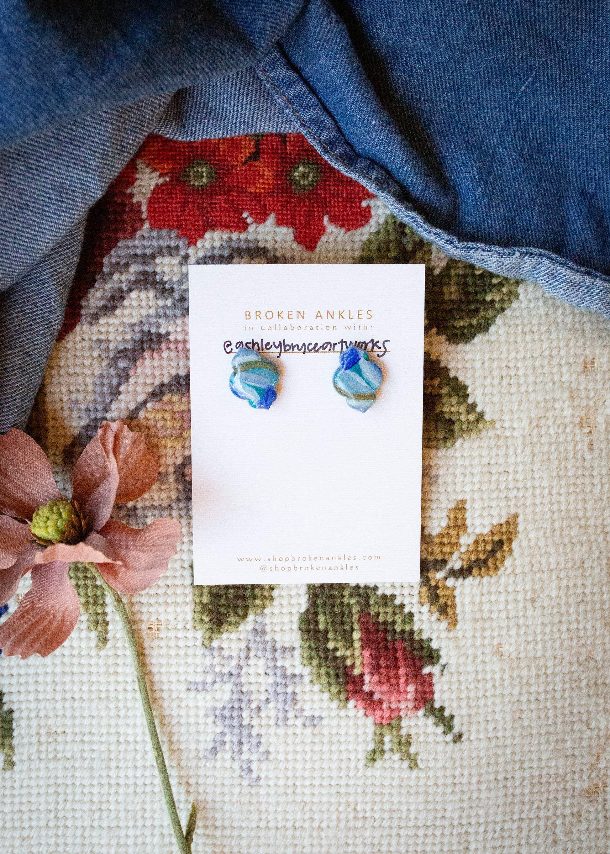 These earrings are handmade in Woodstock, GA. They are made from Polymer Clay, hand printed by @Ashleybruceartworks, and sealed with a resin finish. They are very light and can add the perfect pop of color to an outfit.