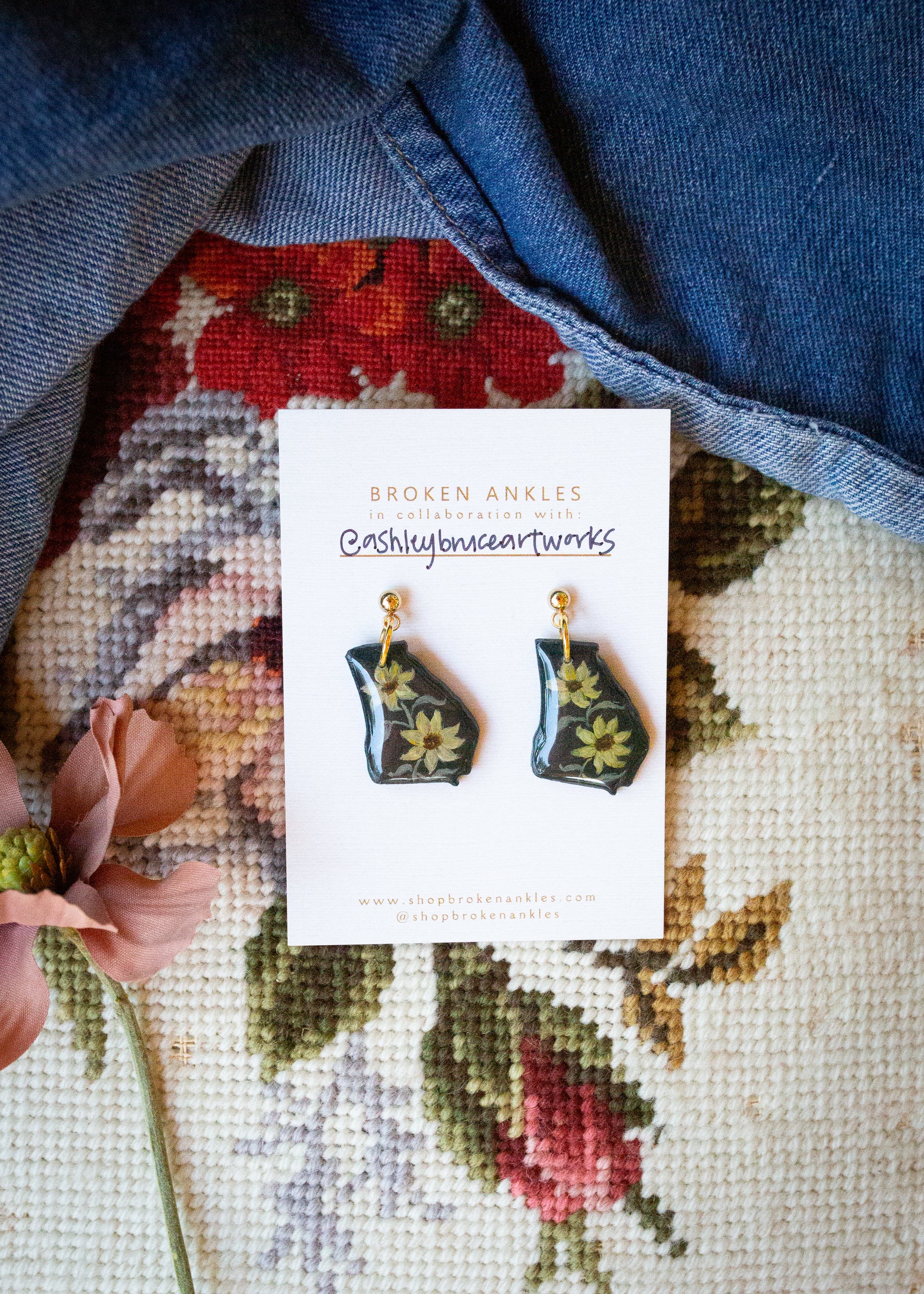 These earrings are handmade in Woodstock, GA. They are made from Polymer Clay, hand printed by @Ashleybruceartworks, and sealed with a resin finish. They are very light and can add the perfect pop of color to an outfit.