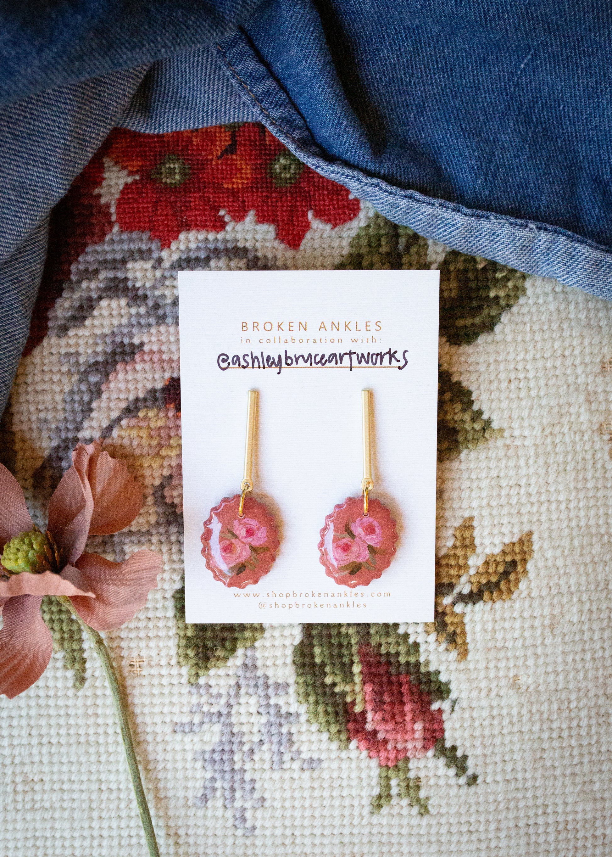 These earrings are handmade in Woodstock, GA. They are made from Polymer Clay, hand printed by @Ashleybruceartworks, and sealed with a resin finish. They are very light and can add the perfect pop of color to an outfit.