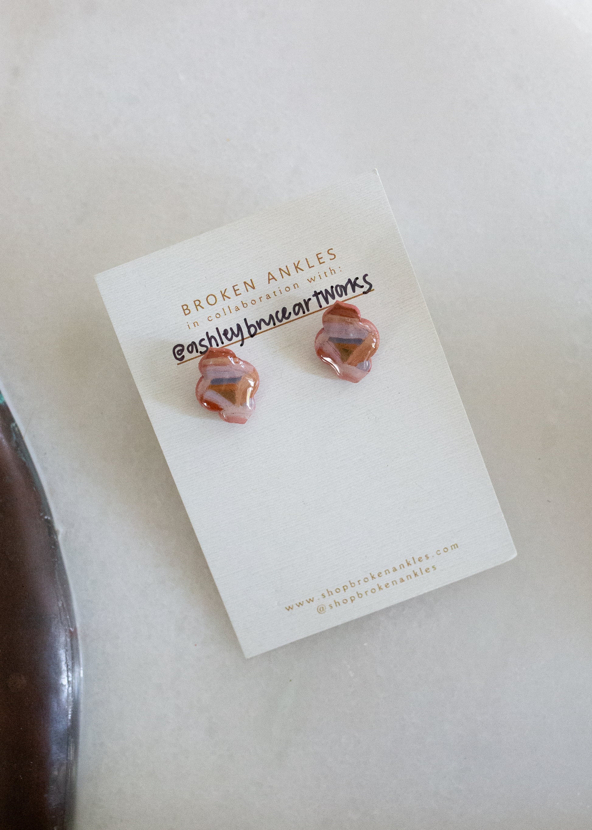 These earrings are handmade in Woodstock, GA. They are made from Polymer Clay, hand printed by @Ashleybruceartworks, and sealed with a resin finish. They are very light and can add the perfect pop of color to an outfit.