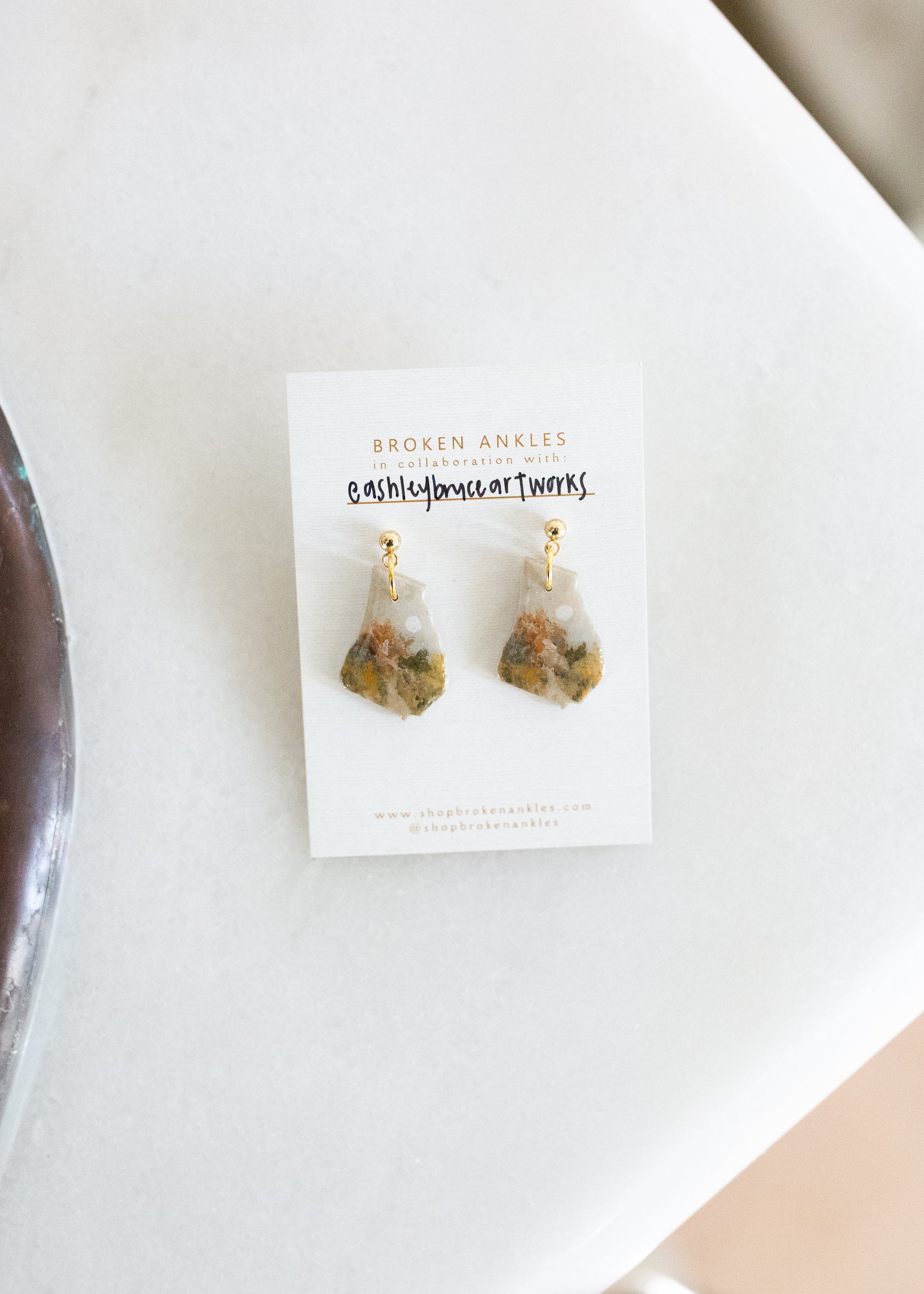 These earrings are handmade in Woodstock, GA. They are made from Polymer Clay, hand printed by @Ashleybruceartworks, and sealed with a resin finish. They are very light and can add the perfect pop of color to an outfit.