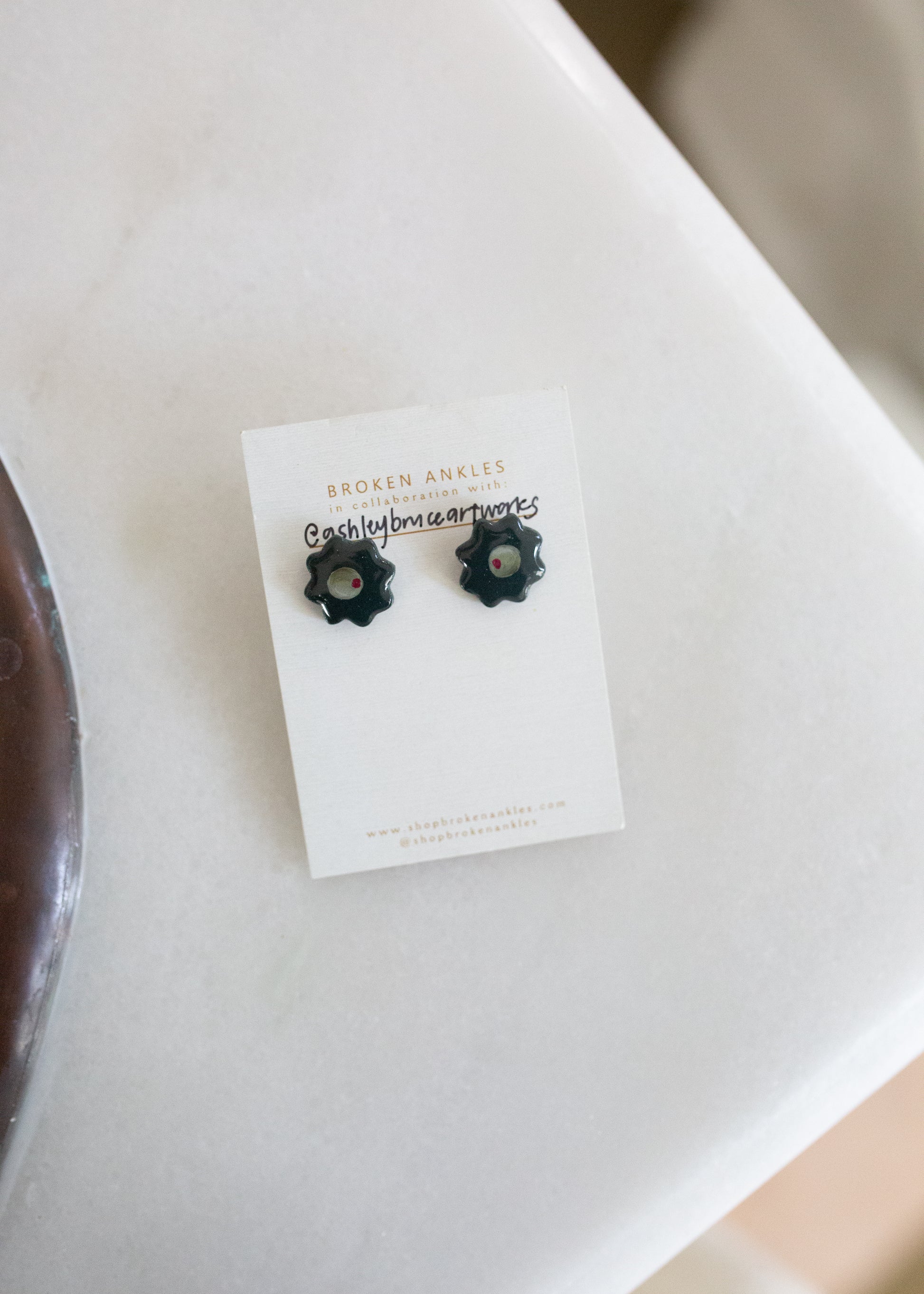 These earrings are handmade in Woodstock, GA. They are made from Polymer Clay, hand printed by @Ashleybruceartworks, and sealed with a resin finish. They are very light and can add the perfect pop of color to an outfit.