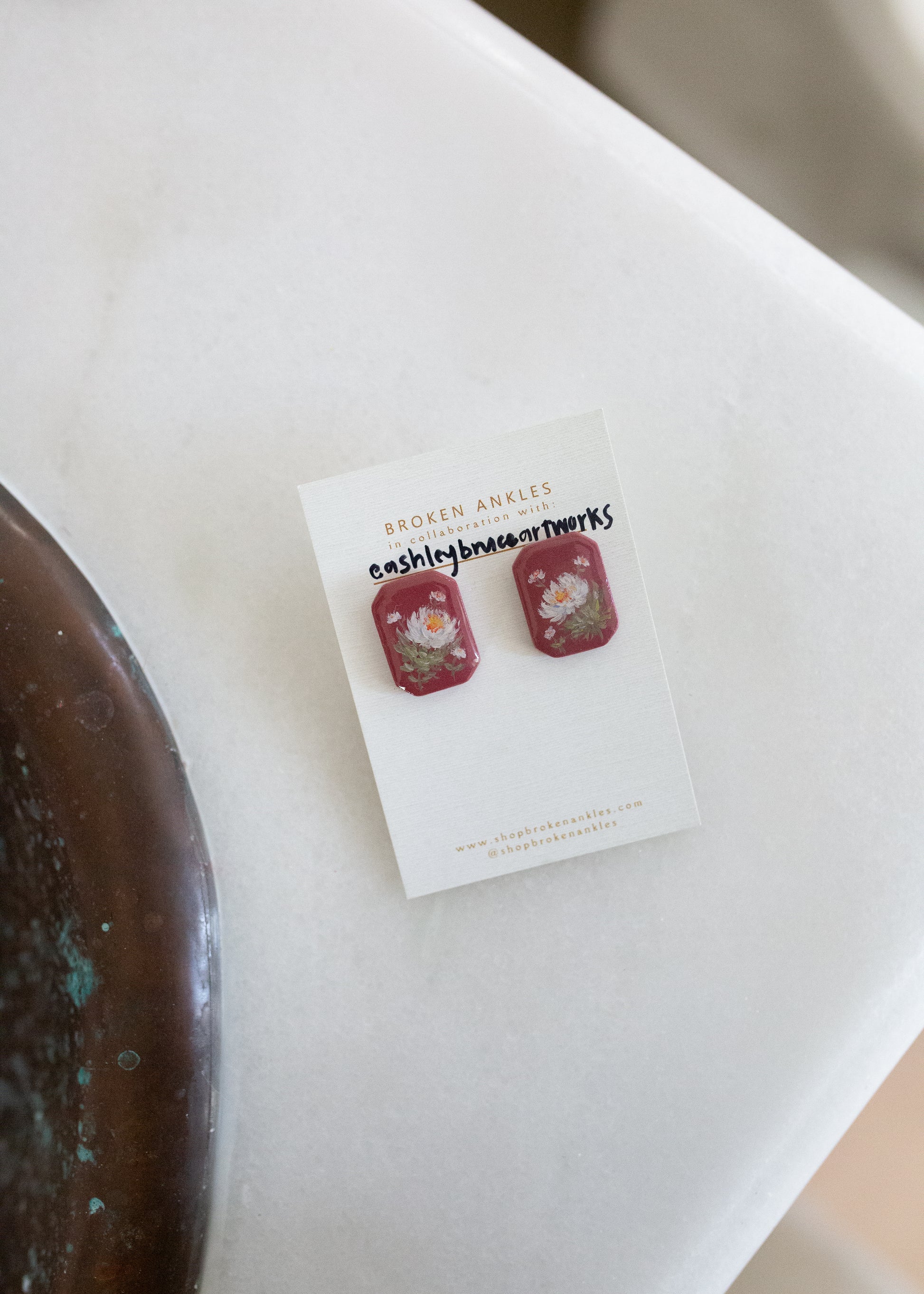 These earrings are handmade in Woodstock, GA. They are made from Polymer Clay, hand printed by @Ashleybruceartworks, and sealed with a resin finish. They are very light and can add the perfect pop of color to an outfit.