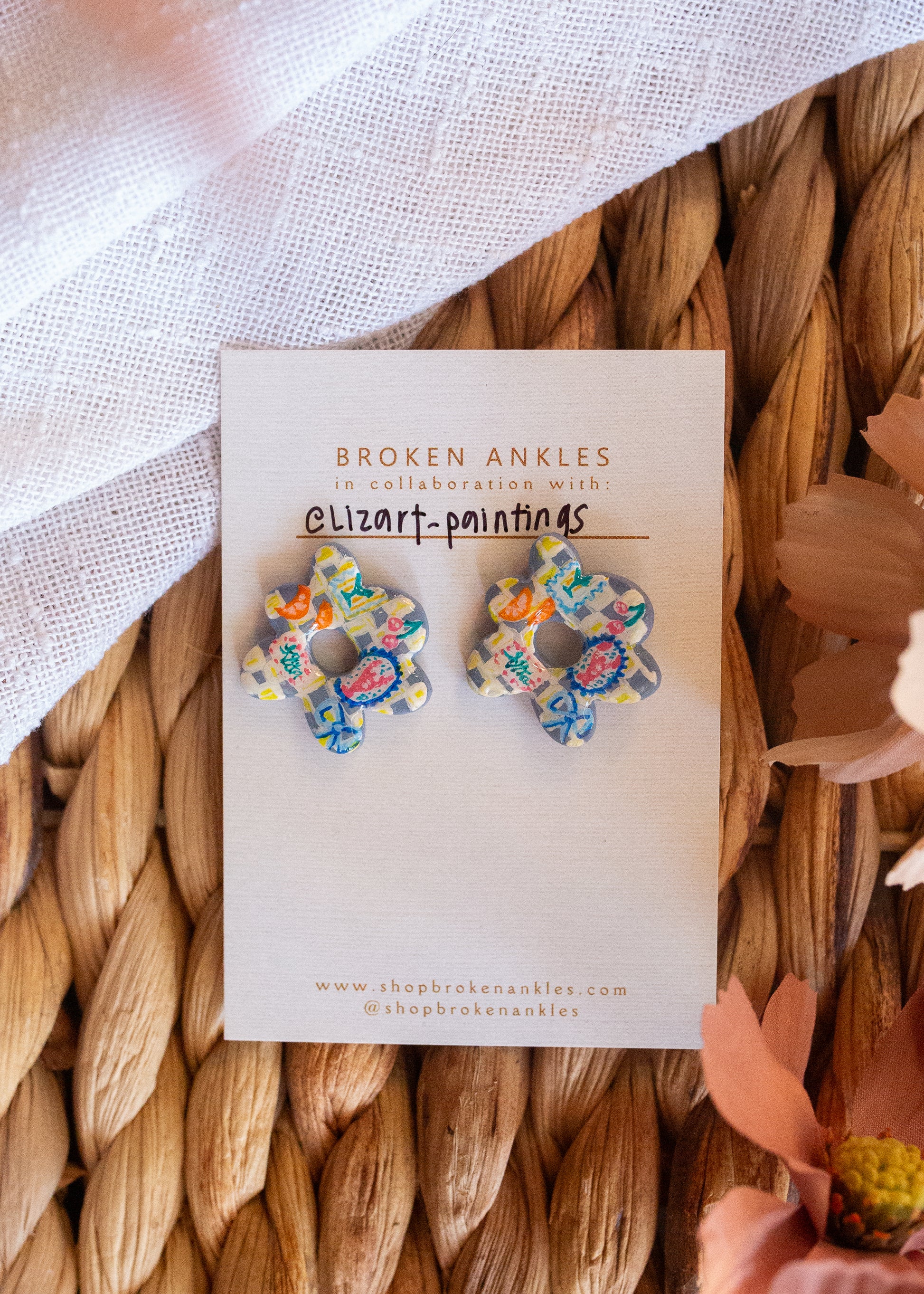 These earrings are handmade in Woodstock, GA. They are made from Polymer Clay, hand painted by @lizarts_paintings and sealed with resin. They are very light and can add the perfect pop of color to an outfit. The post are hypoallergenic, stainless steel and nickel free.
