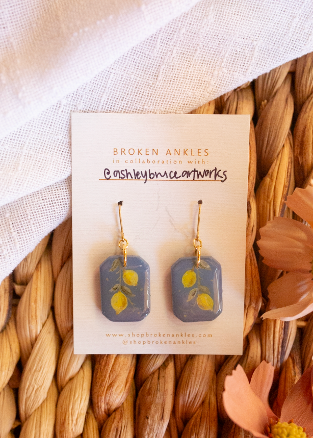 These earrings are handmade in Woodstock, GA. They are made from Polymer Clay, hand printed by @Ashleybruceartworks, and sealed with a resin finish. They are very light and can add the perfect pop of color to an outfit.